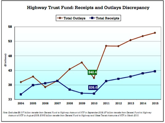 In turn, nearly 90 percent of the HTF funds come from motor fuels. Fuel efficiency and less driving – while both good things – have contributed to the crisis in transportation funding, as gas tax revenues have dropped. The recession was a heavy blow as well, since truck sales declined and, along with them, HTF revenues derived from a sales tax on new trucks. And lawmakers on both sides of the aisle have rejected repeated calls from experts to raise the gas tax or move to a vehicle-miles-traveled fee. Right now, the highway trust fund balance is growing at less than half the rate of inflation.