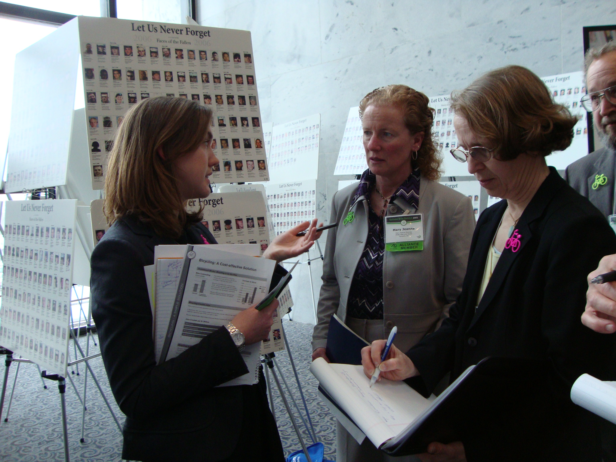 The Virginia group encouraged the freshman Republican Robert Hurt to be a “hero” in his district. They told his aide that with gas prices rising, they hear people saying, “I’d love to ride my bike for health reasons, for transportation — but I feel like I’d get killed on the road,” and they want to make sure new cyclists can go out with confidence. They said bicycling was a “back-to-basics” solution for health and fiscal problems: “It’s simple and it’s cheap.” They said transportation enhancements are a tiny percentage of the federal program and they more than pay for themselves.