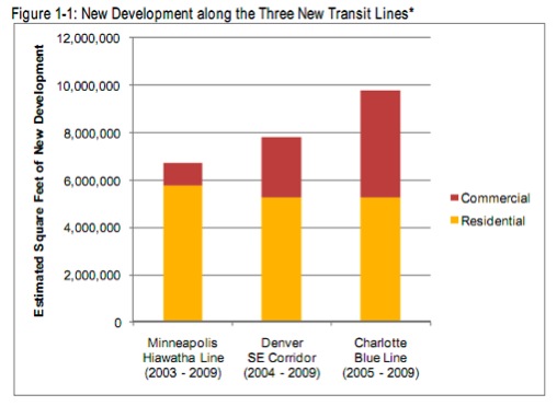 The new CTOD report, “Rails to Real Estate: Development Patterns along Three New Transit Lines” [PDF], picked corridors in the Southeast (Charlotte, NC), the West (Denver, CO) and the Midwest (Minneapolis) to see how transit affected development patterns.