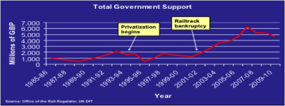 Republicans constantly point to Virgin Rail in the UK as a great privatization success story, but in fact, the company that took over the rail infrastructure went bankrupt just five years after assuming ownership and the government had to take over the company, with the net effect that the taxpayer portion of passenger rail funding increased after privatization. Virgin, the operator, stayed afloat – but according to Darnell Grisby of Reconnecting America, “If Virgin had to cover its own maintenance and capital needs, its balance sheet would be bleeding as well.” This is the model Mica and Shuster are looking to for guidance on the NEC.