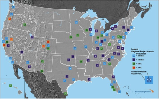 Reconnecting America found strong demand for transit projects around the country but a dearth of federal support for such projects. “There is a huge backlog of federal funding through the New Starts program,” the organization says. If all of the transit projects in this map were funded through the federal New Starts Program at the current spending rate, it would take 73 years to fund them all.