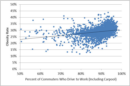 Furthermore, when the research team created a scatterplot comparing obesity rates in U.S. counties with commuting patterns, a “strong relationship” emerged.