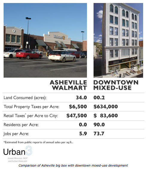 The for-profit development company Public Interest Projects (PIP) reports that urbanism produces much more tax revenue for localities than sprawl. Analyzing tax data around Asheville, North Carolina, the research team found that downtowns — places with the most places to shop per acre — often subsidize the more suburban parts of the community. In places like Asheville, mixed-use developments offered up to eight times (or more) the tax revenue per acre of a Super Walmart.