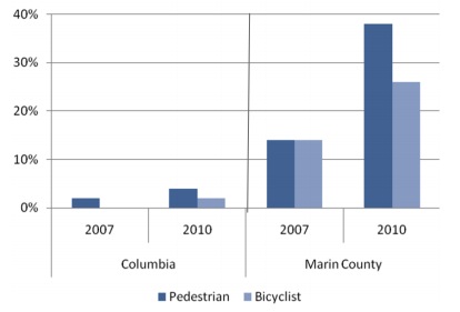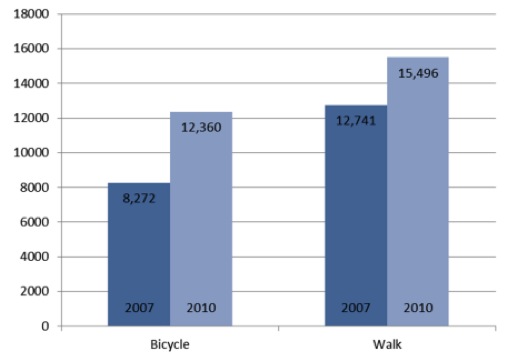 - The four pilot areas saw an average increase of 49 percent in the number of bicyclists and a 22 percent increase in the number of pedestrians between 2007 and 2010.