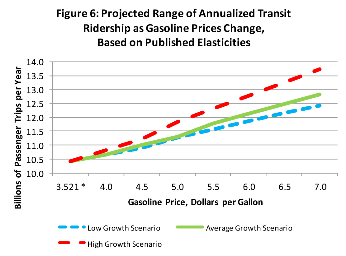 The report, “Volatile Gas Prices Point to Increased Use of Public Transportation,” draws on independent research about “the elasticity of transit ridership” — economist-speak for how much a change in gas prices affects transit use. As APTA points out in their press release, the results indicate an unexpected relationship between gas prices and transit ridership: