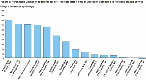 Ridership is up on 13 of the 15 routes that were completed in time to furnish data for the study. (On the other two routes — both in Los Angeles — local officials claim the BRT projects have still led to increased ridership on local bus routes.) In many cases, ridership increased by more than 30 percent in the first year, and five projects saw ridership jump between 60 and 80 percent. These are people who would not have taken transit if not coaxed aboard by these federally-funded improvements, including peak travel time savings ranging from 10 to 30 percent.