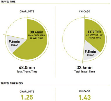 TTI’s Urban Mobility Report, released every year, invariably gives top honors to places that have overbuilt road capacity. The institute measures congestion only by looking at the degree to which traffic slows down people’s commutes. The problem with that, Cortright says, is that “you end up rewarding places that encourage people to drive longer and longer distances, and then you look at those long distances that they’re traveling, and say because they’re moving at a relatively higher speed much of the time that they’re driving, that the system is somehow performing better.”