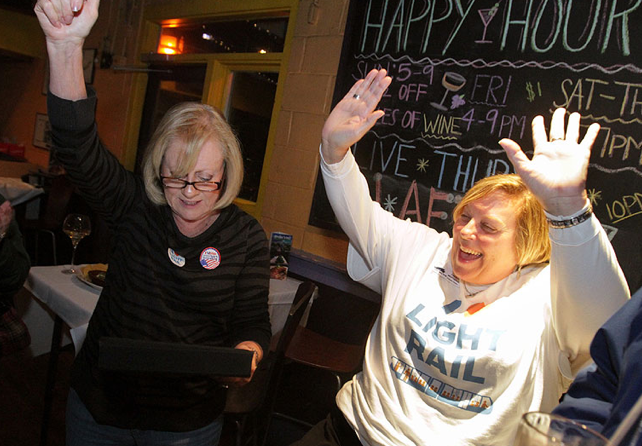 Light-rail supporters, who gathered at an Oceanfront restaurant and wore matching shirts emblazoned “I (heart) light rail,” let out periodic cheers and pumped their fists after hearing early results.