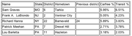 The committee Republican with the highest proportion of car-free and transit-using constituents was Sam Graves of Missouri. His district comprises the entire northern section of the state, including some suburbs of Kansas City and then north and east into the hinterlands. That is the T&I Republican district with the most urban transportation profile.