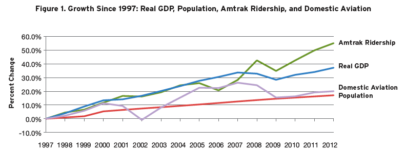 Fastest-growing, that is. Since 1997, Amtrak ridership has grown 55 percent — faster than the general population, faster then GDP, faster than air travel, faster than driving, faster than any other mode of transportation.