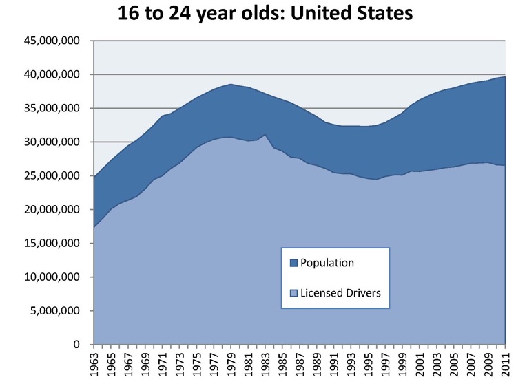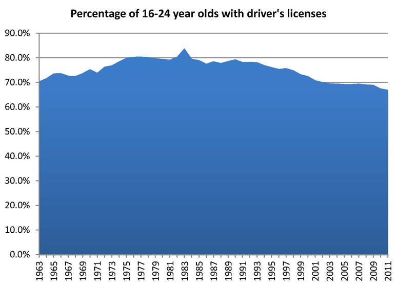 In 2011, the percentage of 16-to-24 year olds with driver’s licenses dipped to another new low. Just over two-thirds of these young Americans (67 percent) were licensed to drive in 2011, based on the latest licensing data from the Federal Highway Administration (FHWA) and population estimates from the Census Bureau. That’s the lowest percentage since at least 1963.