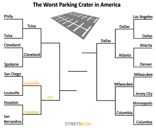 NCAA basketball has nothing on the drama, the intrigue, the heartbreak of a competitive parking crater tournament. We’re now into the “Elite Eight” round of Parking Madness, and today’s winner will join Dallas in the Final Four. It’s going to be a fierce competition between Louisville and Houston.