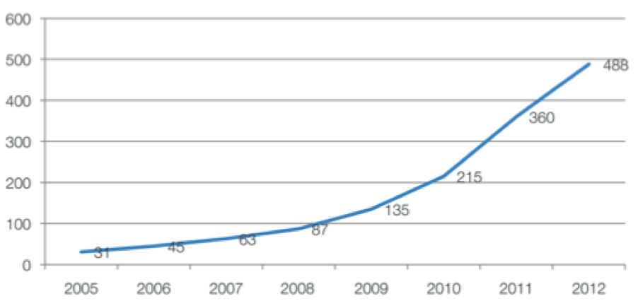 Number of complete ctreets policies nationwide, 2005–2012. Image: National Complete Street Coalition