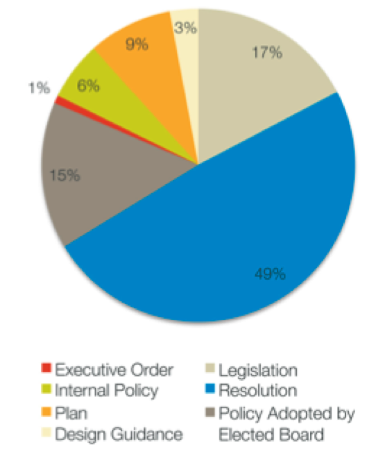 Whether or not progress from last year’s policies can be ascertained, the best policies establish clear and concrete criteria to judge future success. In Indianapolis, the city pledges to quantify bike lane mileage, pedestrian accommodation, new curb ramps, crosswalk and intersection improvements, transit stops accessible via sidewalks and curb ramps, crash rates by mode, and the rate of children walking or bicycling to school. Clearly, policies that have the full force of the law behind them, whether passed by legislation or executive order, will produce more impacts than those that are nothing more than nonbinding resolutions.