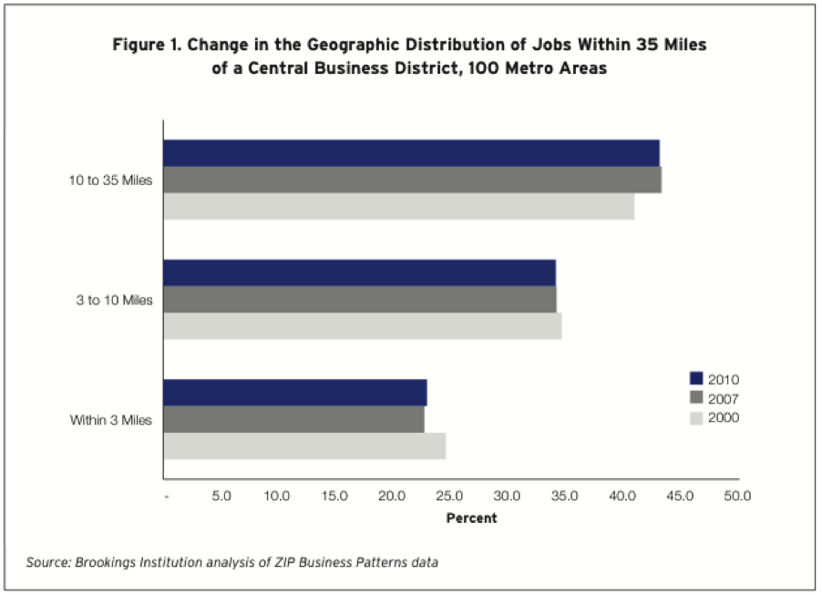 “After dropping two percentage points from 2000 to 2007, the share of metropolitan jobs within three miles of downtown stabilized from 2007 to 2010,” she wrote. “However, by 2010 nearly twice the share of jobs was located at least 10 miles away from downtown (43 percent) as within three miles of downtown (23 percent).”