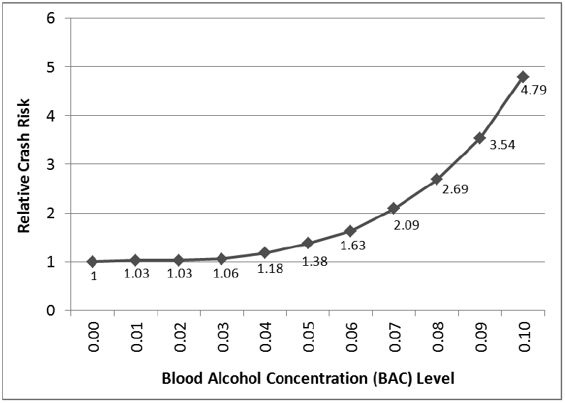 Studies have shown impairment — divided attention — swerving out of the lane — can begin at blood alcohol levels as low as .009 percent. Risk of crash begins to increase at .04. One study found drivers with .05 percent blood alcohol level were 38 percent more likely to crash than sober drivers.