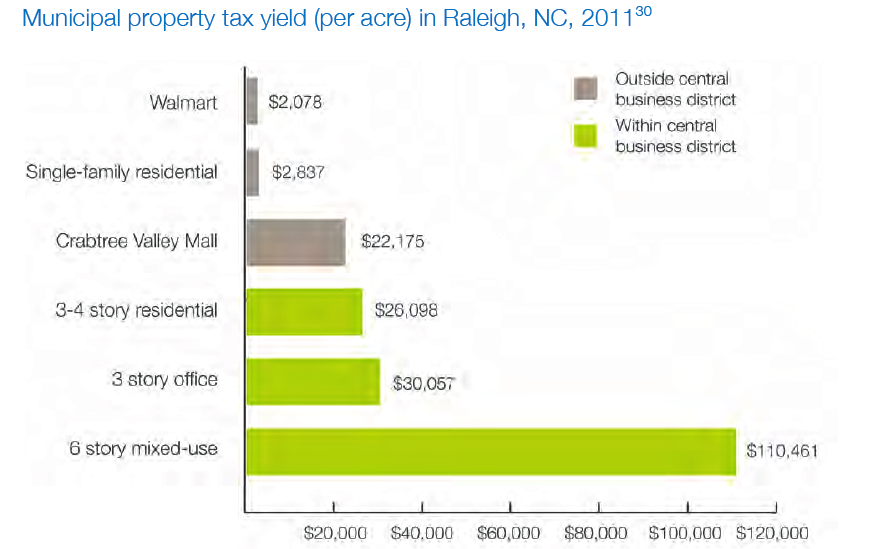 Finally — and this is the most important part — smart growth provides a better return for cities and taxpayers. SGA’s analysis showed that walkable development generates about 10 times more tax revenue per acre than traditional suburban development. This “alleviates the pressure to raise taxes, which is pressure we feel across the country,” said Fulton.