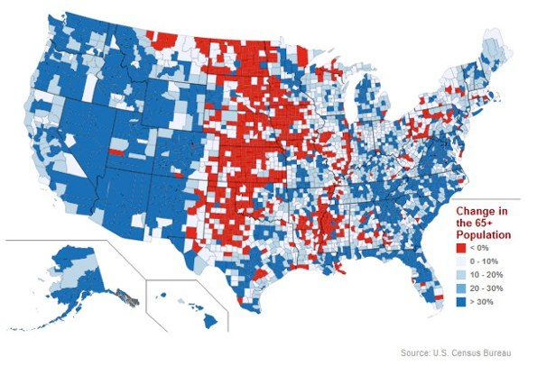 For these reasons and others, boomers are increasingly attracted to urban areas. A map in Florida’s article yesterday in Atlantic Cities charts evidence of this trend, with the center of the country (save for metro areas like Kansas City and Austin) losing the most seniors and the East and West coasts gaining.