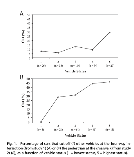 In the first experiment, about 12.5 percent of drivers proceeded through an intersection without yield to other drivers with the right of way. The drivers of expensive cars were much more likely to engage in this illegal behavior — 30 percent of the drivers classified in the most “high-status” category cut off other drivers. In the second experiment, 35 percent of all drivers failed to yield to pedestrians, compared to 46 percent of those driving the fanciest cars.