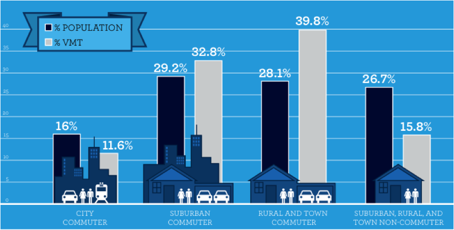 NRDC looks for middle ground by giving people more achievable goals — just take transit a few days a month, or just move 25 percent closer to work. The problem is, not all of these actions are scalable. Transit service simply isn’t available everywhere. Where it is readily available, people use it — NRDC estimates that 23 percent of city folks commute by transit at least four days (eight trips) a month, but that number plummets to 6 percent of suburbanites and just 2 percent of rural folks.