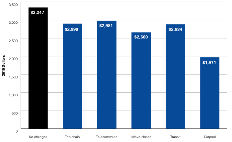The report is at times is more confusing than enlightening. First, Perks and his co-author, Craig Raborn, categorize commuters by where they live: urban, rural, and suburban. They also looked at non-urban non-commuters — those who don’t travel to a job every day. Then they looked at a few different ideas for reducing driving — carpooling, taking transit, trip-chaining, telecommuting, and moving closer to work. And they attempted to arrive at a dollar figure for how much any of those four types of commuters would save if they supplanted various amounts of driving with various alternatives.