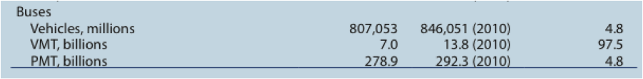 Wait a minute, let me get this straight. There are 4.8 percent more commercial (inter-city) buses in 2010 than there were in 2005. Considering how BoltBus and MegaBus have revolutionized inter-city bus service, making it the fastest-growing travel mode, 4.8 percent growth in five years seems a little stingy. Other reports have put it at 6 percent growth just from 2009 to 2010.