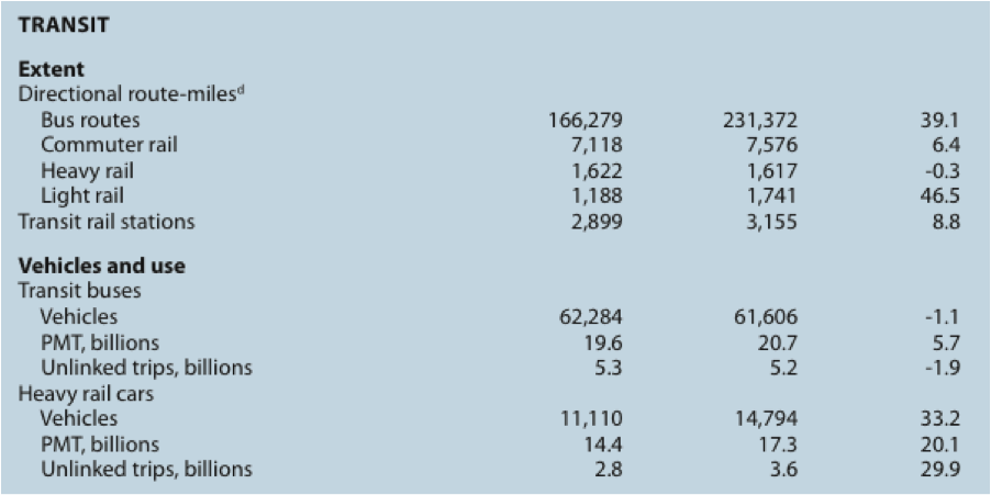 But perhaps this is where we get to the rah-rah part of our story. Light rail has grown by 46.5 percent, thanks to big extensions in Denver, Salt Lake City and Dallas and new systems in San Diego and Phoenix. This big light-rail push has led to a 39 percent growth in passenger-miles-traveled. Meanwhile, commuter rail and heavy rail ridership is up 20 percent.