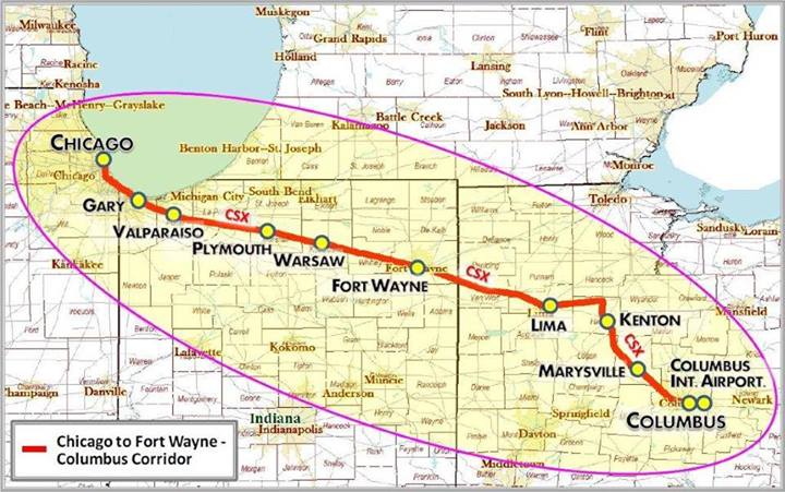 Now city leaders are throwing their support behind a new plan to create a rail link from Columbus to Chicago via Fort Wayne, Indiana. A study by the Northeast Indiana Passenger Rail Association [PDF] makes it seem like a pretty sweet deal. The group estimates that the cost of linking the three cities on existing freight rail lines would be about $1.3 billion — about one-tenth the price of connecting the two cities by highway. The group estimates the trains could travel between 110 and 130 miles per hour, completing the 355 mile trip in under four hours, making it competitive with flying and driving. The project, they estimate, would generate $1.70 for every $1 invested and would create up to 26,800 permanent jobs.