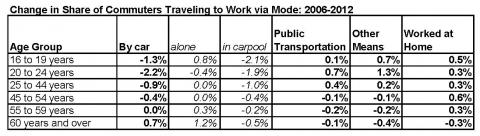 “Those young adults have significantly increased their use of public transportation and ‘other means’ of getting to work (which includes bicycling, walking, taxis and motorcycles),” Dutzik writes. “Car commuting is less important for everyone under 55 years of age, public transportation is more important for everyone under 45 years of age (with only small, likely insignificant declines among older Americans), and everyone except folks in the oldest age group is working more from home… Generational shift, anyone?”