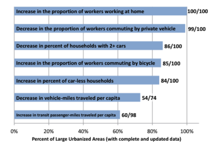 In 99 of the nation’s 100 largest regions — the cities and suburbs that are home to more than half the U.S. population — fewer people got to work in a private vehicle in 2010 than in 2000. In the vast majority of those areas, households are shedding cars while more people are getting on the bus and taking up biking. These 100 regions are the engines of the U.S. economy and where most of the nation’s population growth is happening.
