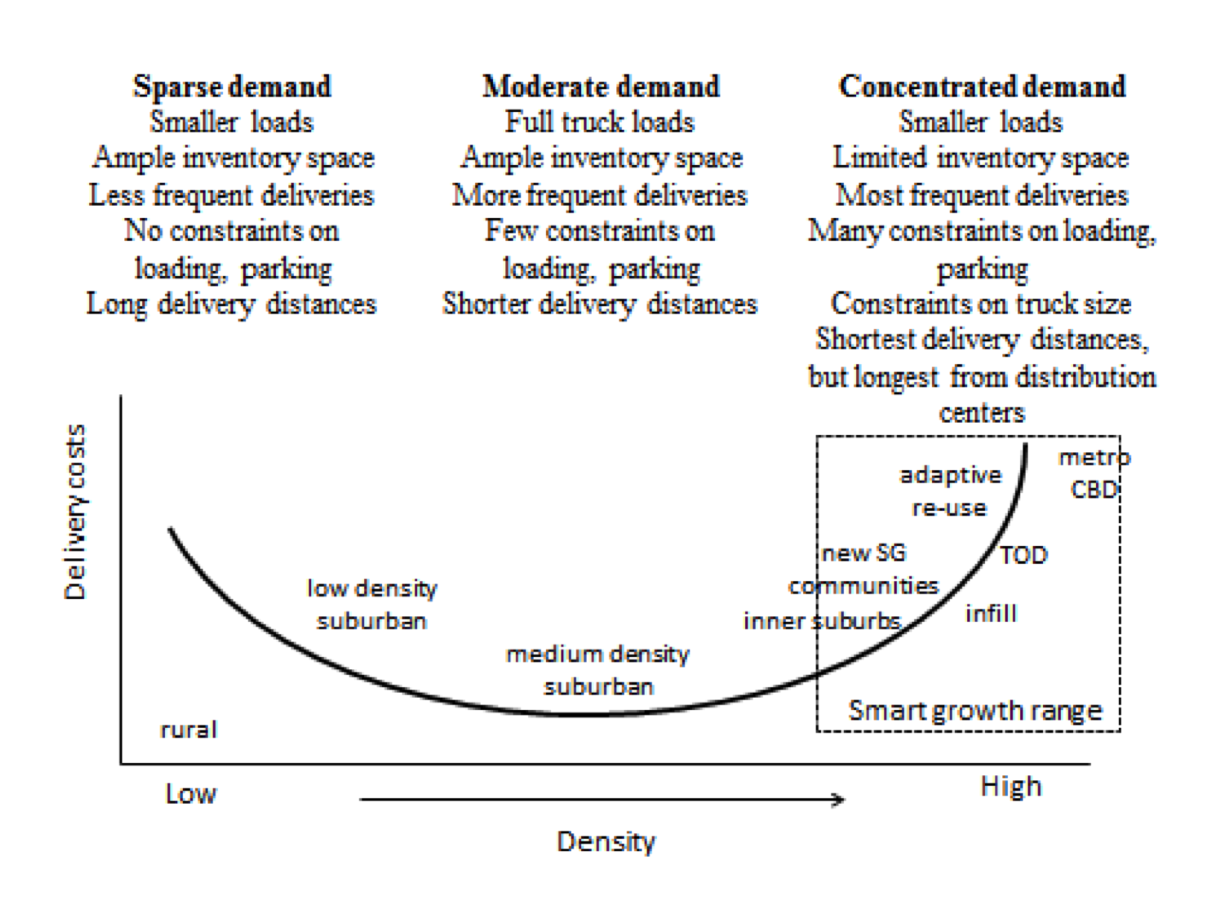 “Smart growth is all about moving up that curve to become more dense,” said Giuliano. “And the more you move up the curve to become more dense, the more all of these challenges will kick in. And in smart growth, nobody ever thinks about freight.”