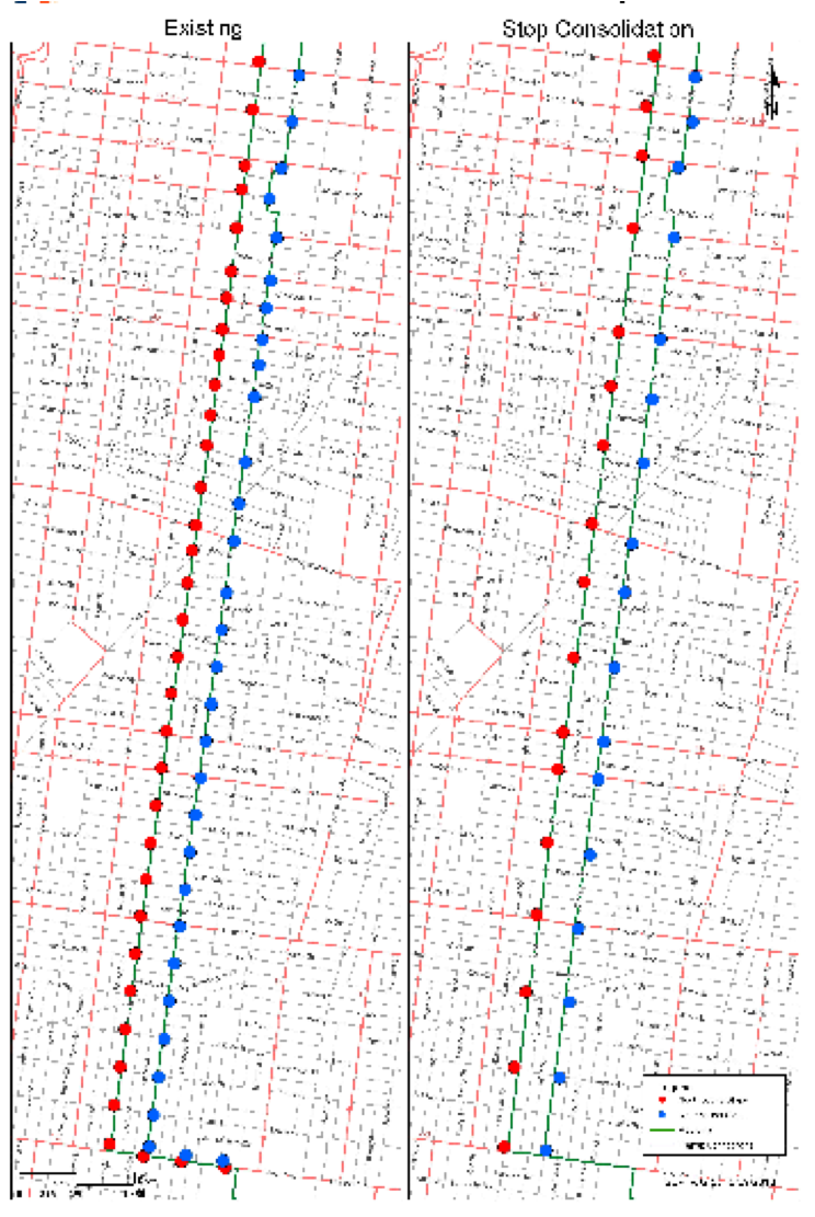 - Though “stopping every block is in many ways a venerable Philadelphia tradition,” according to Ben-Amos, they decided to consolidate half of the stops to save time. The blocks are short enough that riders still wouldn’t have to walk too far, and they were careful to eliminate the lower-ridership stops. Such an effort in Los Angeles had found that a 10 percent reduction in the number of stops yielded a 1.3 percent reduction in running time. Just yesterday, Eric Jaffe at Atlantic Cities spotlighted a story by News 1130 in Vancouver on research “showing that eliminating some bus stops ‘reduces travel times significantly without drastically affecting the number of people served along a route.’” Given the time savings from decelerating and accelerating, it would appear to be a winning strategy for the 47.