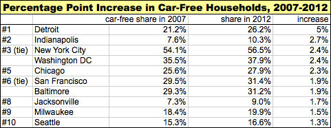 The share of car-free households varies considerably among the 30 largest American cities, from 56.5 percent in New York to 5.8 percent in San Jose. But between 2007 and 2012, the proportion of car-free households grew in 21 of those 30 cities. The change was especially pronounced in cities where a lot of people were already getting by without cars. The 13 cities with the highest proportion of car-free households in 2007 all saw an increase between then and 2012, reports Sivak.