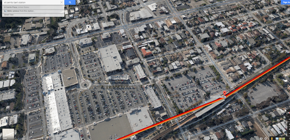 This location was one in a series sent to us by the anonymous author of Systemic Failure, who goes by the pen name “Drunk Engineer.” All of the photos were of parking craters at Bay Area Rapid Transit stations. You can see the line and the station highlighted in red.