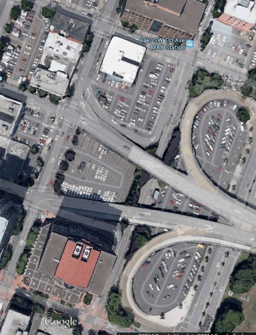 Reader Byron Palmer submitted this photo, which shows where the Morrison Bridge — one of Portland’s most heavily used — empties into the city. The heavy traffic and highway-like design depress land values and lead to low-value uses like surface parking. Who would want to have lunch, or take a walk, in that area?