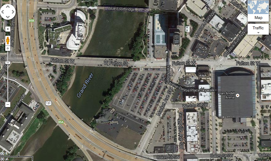 Ah, nothing stirs the soul like waterfront surface parking. This spot bears a couple of hallmarks of the classic American parking crater: proximity to an urban highway and to a nearby sports arena — in this case, Van Andel Arena, home of the Grand Rapids Griffins minor league hockey franchise. Looks like the highway/arena combo has really done a number on this part of downtown.