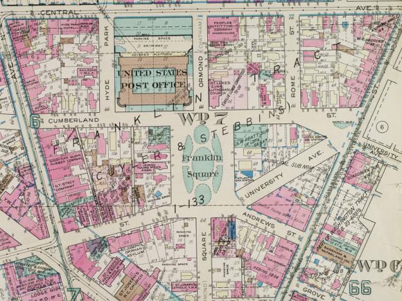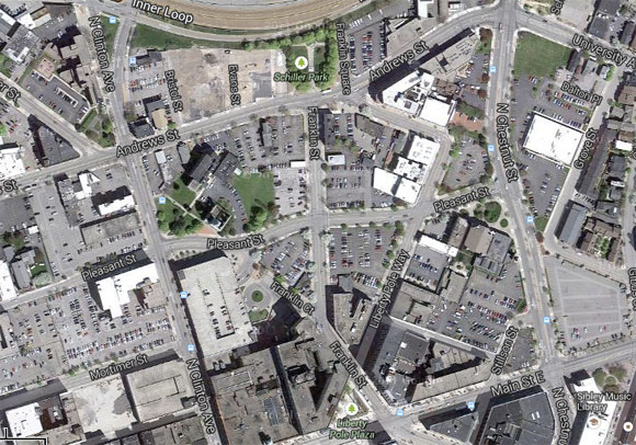 The area called Franklin Square on the old map was once Rochester’s central square, where the community gathered every year to raise a Christmas tree. Now that land is next to the Inner Loop highway and a whole lot of parking. Hard to imagine that any celebrations still take place here.