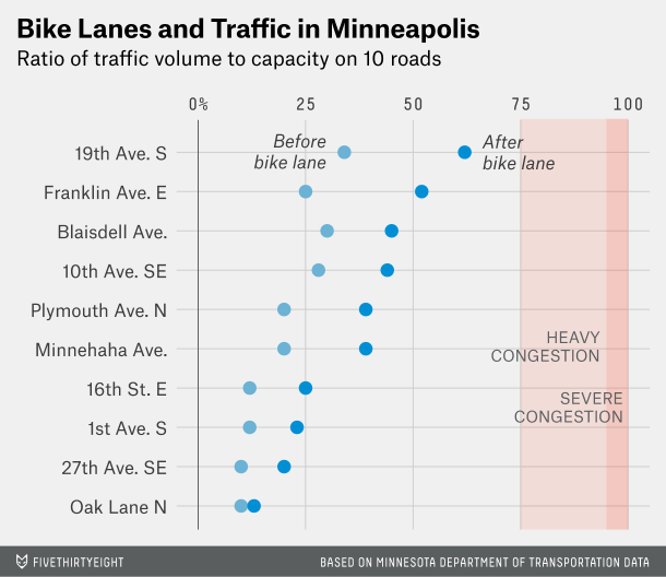 The fivethirtyeight analysis will come in handy in many cases, to show that traffic hasn’t backed up where bike lanes were installed. But to create great bike networks that shift a lot of trips from driving to cycling, we’ll need to build some bike lanes that claim space on the most trafficked streets.