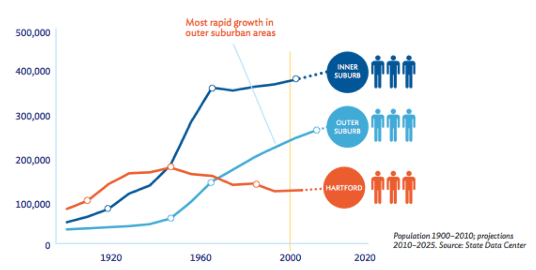 A new report from the Hartford Foundation for Public Giving shows how Hartford is now paying for the decision to facilitate car travel first and foremost. The population is still bleeding out of the city and into the suburbs, especially among whites. The population is also aging across the region, with the number of seniors expected to grow by 73,900 between 2010 and 2025, while the number of people under 55 is projected to shrink by 42,900.