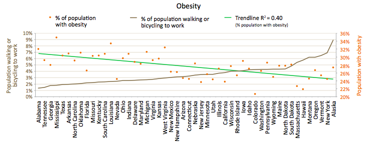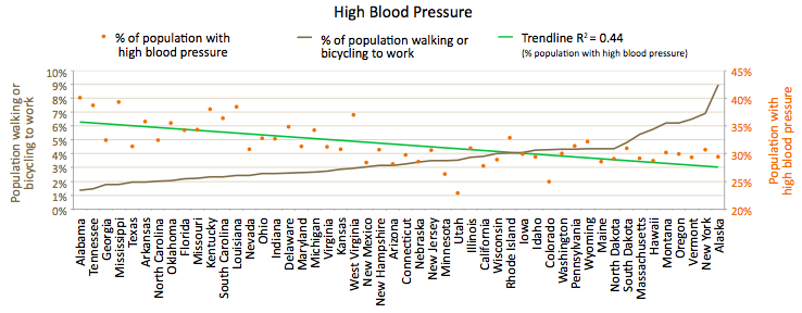 The Alliance compiled active commuting rates in the 50 largest American cities as measured by the U.S. Census. Then it compared that data with health information from the CDC. On health outcomes like diabetes, obesity, and high blood pressure, a pretty clear correlation emerges.