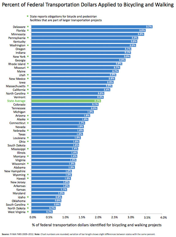 The Alliance for Biking and Walking put together this handy chart, showing roughly what proportion of each state’s federal funding goes toward projects for walking and biking.
