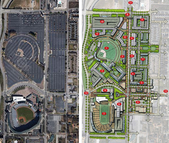 The plan calls for a large sports complex, and it doesn’t look like a great walkable street grid. But it will have a mix of uses, including academic buildings, housing, and retail. It beats an ocean of surface parking, without a doubt.