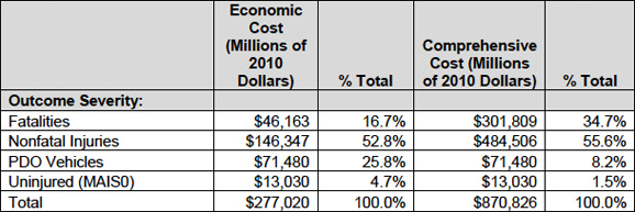 In a new report, “The Economic and Societal Impact of Motor Vehicle Crashes, 2010,” NHTSA concludes that in 2010 motor vehicle crashes imposed “$277 billion in economic costs… and $594 billion in harm from the loss of life and the pain and decreased quality of life due to injuries.” That adds up $871 billion, or nearly $2,800 for every man, woman, and child in the United States.