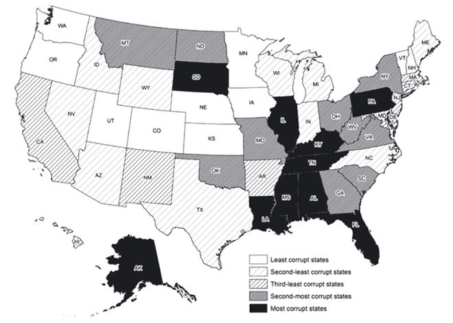 Public corruption for each state was ranked based on 25,000 convictions between 1976 and 2008. Overall, the authors found, the 10 most corrupt states spend $1,300 more per person annually than the average state.
