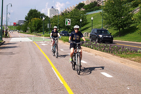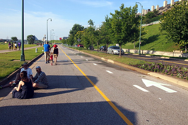 That’s exactly what’s happened last weekend in Memphis, Tennessee, where half of a separated four-lane highway was converted into a safe, direct and stress-free walking and biking route along one mile of the Mississippi River. As we reported in March, Bluff City engineer John Cameron decided this spring to follow the recommendation of urban planning consultant Jeff Speck and experiment with a permanent new car-free space between downtown and the planned Harahan Bridge connection to Arkansas.