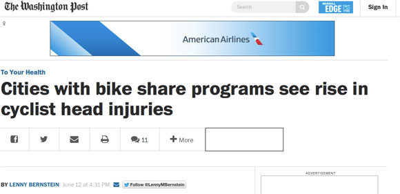 So how is it that a study that documented drops of 14 percent in the number of cyclist head injuries and 28 percent in total cyclist injuries in U.S. cities with bike-share programs got this headline in the Washington Post last month?