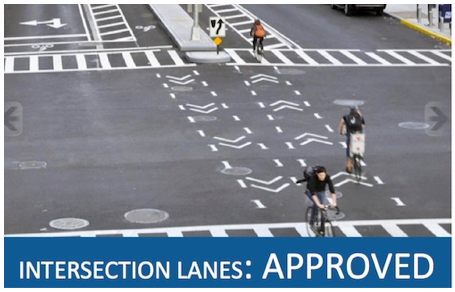 Late last month, the National Committee on Uniform Traffic Control Devices gave its approval to 11 treatments, including these two bike lane configurations. Committee members also, as anticipated, approved bike boxes and bike signals, which had been considered “experimental,” as well as bike lane markings that continue through intersections.