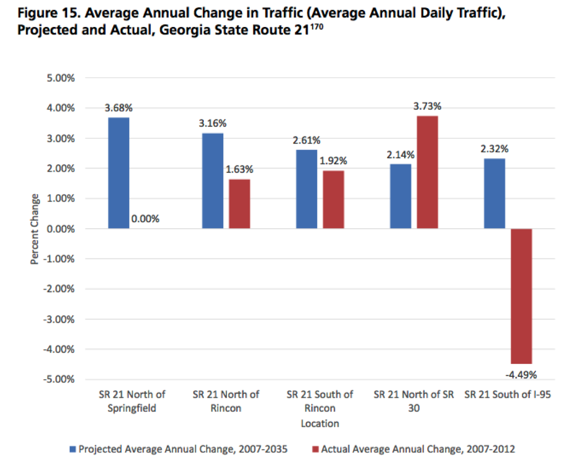 Traffic on Route 21, however, has failed to grow at the rate anticipated by officials along most of the relevant length. Of five locations on Route 21 parallel to the proposed parkway where both projections and traffic counts were available, only one saw traffic increase at an average rate higher than is expected to happen if the Effingham Parkway is not built. The other locations saw traffic rise far less than projected, stay flat, or even drop.
