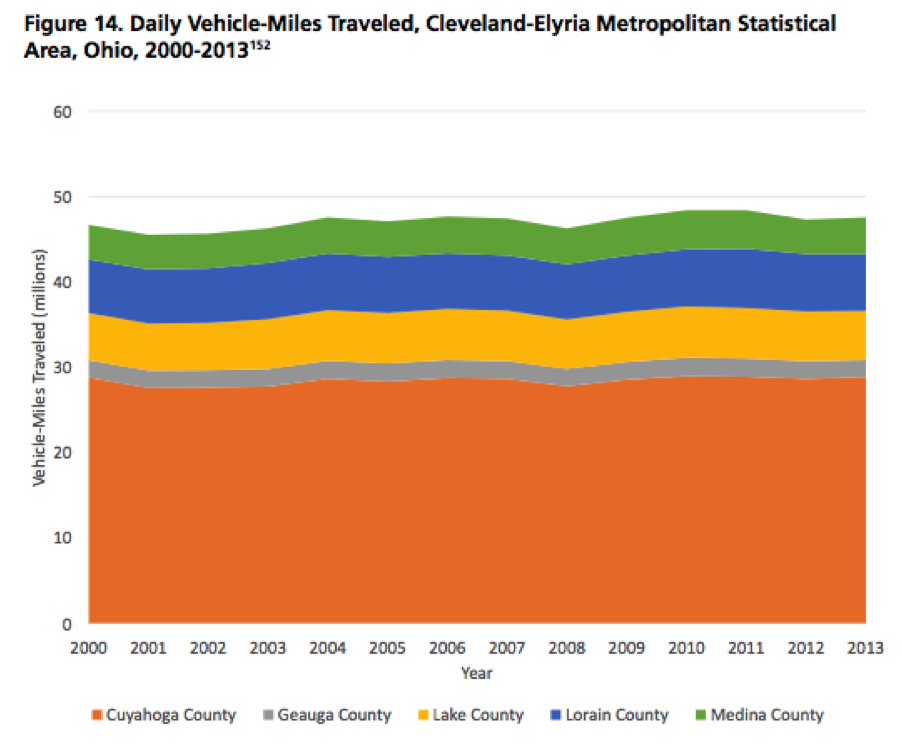 Expanding road capacity is a questionable investment given recent travel trends in the Cleveland area. While ridership on the regional transit authority has been increasing, vehicle-miles traveled (VMT) in Cuyahoga County rose an anemic 0.3 percent from 2000 to 2013, an annual average of 0.02 percent. In the five counties making up the Cleveland-Elyria Metropolitan Statistical Area, VMT climbed just 1.9 percent from 2000 to 2013, an annual average increase of 0.14 percent.