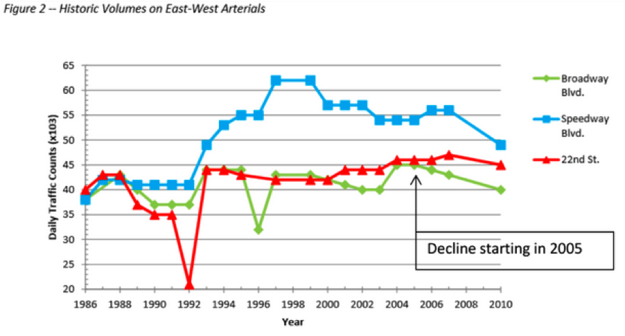 But the engineering fantasies of the 1980s still made it into a 2006 ballot initiative, in which Pima County residents voted in favor of a half-cent sales tax to pay for the RTA’s 20-year plan. (Pima is the only county in the RTA’s jurisdiction.) Project number 17 on that plan was the widening of Broadway Boulevard, in accordance with 1987 projections that had already been proven wrong.